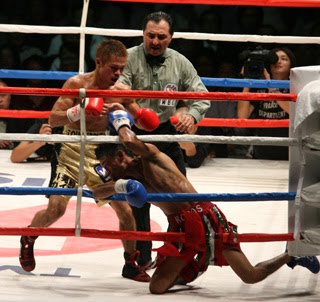 写真は最終回に河野がロハスをダウンさせたシーン。しかし倒し切れず、終了ゴングに持ち込んだメキシカンが判定勝ちでチャンピオンとなる。
