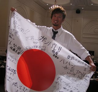 なお石田はメキシコでの試合に備えて今月5日にロサンゼルス入りし、同地でトレーニングを続けている。さぞや困惑していることだろう。写真は8月5日大阪市内で催された壮行会の石田。