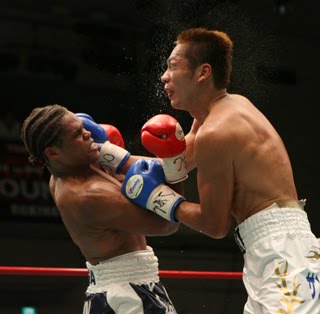 スコアは浅尾115-114、杉山、中村がともに116-113でいずれもチャンピオンの勝利を支持した。勝てば日本タイトル4階級制覇の新記録が誕生するはずだった湯場は、それでも「もう一度チャーリーとやりたい」と現役続行宣言。=写真は11ラウンド、湯場に右アッパーを突き上げるチャーリー=