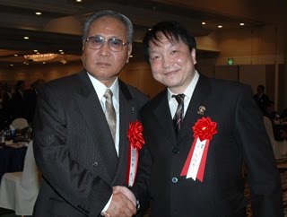 アマチュアの実力者・山根明氏(70)の社団法人日本アマチュアボクシング連盟副会長就任を祝うパーティーが29日昼大阪市内のホテルで催された。この日は全国各地から関係者が集い、パーティーの参加者は2百人を超えた。アマチュア関係者はもとより、複数のプロジム会長や、また六車卓也、名城信男の新旧世界王者(プロ)の姿も。中でも注目は日本プロボクシング協会大橋秀行協会長(45)が北澤鈴春事務局長とともに駆けつけたこと。この種のアマチュアの会合に、プロの協会長が出席するのは近年極めて異例なことである。