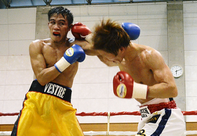 ロペスに右クロスを浴びせる中澤(右)