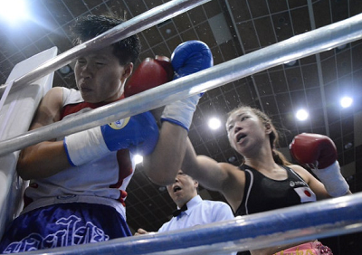 WBC女子世界ミニ・フライ級チャンピオンの黒木優子(Yukoフィットネス)が16日午後福岡・九電記念体育館のリングに上がり、ノンタイトル8回戦でタイのカニタ・サックナロンを3回43秒TKOに破った。 カニタをコーナーに追い詰める黒木(右)
