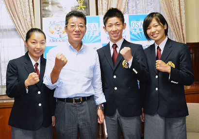 報告には同時期に中国内モンゴル自治区で開かれたアジア女子選手権に出場した近畿大1年の佐伯霞、河野沙奈の両選手、澤谷廣典総監督代行、名城信男コーチも同席した。松井知事は「ボクシング部はいろいろあったでしょうが、近大ボクシングここにありを全国に鳴り響かせてください」と語り、東京五輪を目指す3人に「世界の舞台で活躍して」とエールを送った。