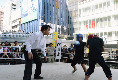 ボクシングに打ち込むことで、子どもたちのいじめをなくそうと金沢英雄・金沢ジム会長(68)が中心となり、西日本ボクシング協会も協力して今年5月に開催。好評だったため第2回を開いた。道頓堀川の遊歩道にリングを設置、ゴングも鳴らし本式の試合形式。採点はつけなかったが、出場選手はふだんジムで鍛えたパンチやフットワークを披露した。道頓堀川を航行する遊覧船の乗客からも歓声があがった。また、40歳近くのアイドルグループ「サムライローズ」もリング上で歌い踊るなど、シルバーウイークを盛り上げるイベントとなった。