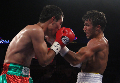 ロマチェンコは途中から余裕の試合運び。断続的に高速コンビネーションを浴びせてメキシカンをロープへ送る。迎えた10回、ウクライナ人の左ボディーが決まると、コアシチャはヒザをつき、カウントアウトされた。(三浦勝夫) Photo/SUMIO YAMADA