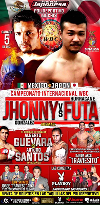 ■カシミジムのハリケーン風太(中岸風太、20勝11KO5敗1分)が12月5日、メキシコのロスモチスで元2階級制覇王者でWBC・S・フェザー級8位のジョニー・ゴンサレス(メキシコ=58勝49KO10敗)と対戦する。風太にとっては世界ランク獲得のチャンス。3月にWBCフェザー級王座を失った34歳のゴンサレスは9月の再起2戦目を落としており、ここが正念場だ。同じ興行では2013年に山中慎介(帝拳)に挑戦して敗れてから4連勝のアルベルト・ゲバラも出場。長谷川穂積(真正)と対戦経験のあるアルツロ・サントス・レイジェスと10回戦。