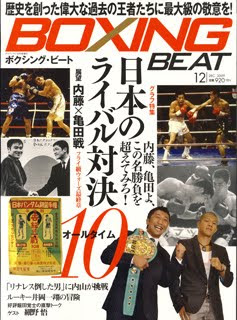 WBC世界フライ級王座を懸けた内藤大助×亀田興毅の激突は、いよいよ今月29日の決戦に向けてカウント・ダウンが始まります。本日発売の「ボクシング・ビート12月号」は「フライ級ウォーズ最終章・ピリオドの打ち方」と題して、この試合のプレビューを巻頭で大々的に取り上げています。また、これに関連して過去の「日本のライバル対決」名勝負10番をグラフ頁で特集しています。原田×青木、沼田×小林、辰吉×薬師寺、畑山×坂本ら懐かしい名勝負の興奮が甦ります。フィットネススポーツ社発行、定価920円。お近くの書店でお求めください。(書店にない場合、注文するとすぐに取り寄せてくれます)