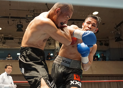 体格で勝る松山が好スタート切ったかに見えた。射程の長いジャブをヒットさせ、右ストレート、左ボディブローもコネクト。スピードもあった。しかしパンチャーの土屋が一瞬のタイミングをつかんでワンツーを放つと、松山がグシャリとキャンバスへ落下。立ち上がるのもやっという状態を見た主審が試合を止めた。「後半勝負だと思っていた」という土屋はわずか100秒で勝利。戦績を19勝16KO4敗とした。無念の松山は12勝6KO6敗。