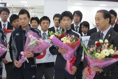 ブラジルのリオデジャネイロで開催されたアマチュアのプレ五輪大会「リオ2016テストイベント」でフライ級金メダルを獲得した田中亮明(駒沢大学)が8日夕方、日本代表チームとともに成田空港に帰国した。