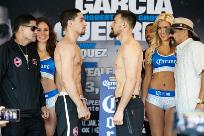 前WBA&WBC世界S・ライト級チャンピオンのガルシア(31勝18KO無敗)は昨年8月のウェルター級進出第一戦で元世界王者ポール・マリナッジ(米)に勝利。今回の試合に2階級制覇をかける。元複数階級制覇王者のゲレロ(33勝18KO3敗1分)は昨年3月のキース・サーマン(米)戦に完敗するなど、ここ4戦で2勝2敗。生き残りをかけた戦いとなる。計量では両者のチーフトレーナーで実父のアンヘル・ガルシアとルーベン・ゲレロが罵りあう場面もあった。