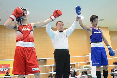 注目のライト級は、ロンドン五輪銅メダリストの清水聡(ミキハウス)と全日本選手権V6の成松大介(自体校)が対戦。これが14年アジア大会以来の実戦となる清水に対し、自体校の後輩成松が積極的な攻撃でやや押し気味にみえた攻防は、2ラウンド終了直前に偶然のバッティングで両者が負傷(清水は前頭部、成松は右まぶた)。このため既定の3ラウンドを待たず、この回で終了となった。
