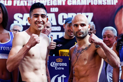 米カリフォルニア州アナハイムのホンダ・センターで27日(日本時間28日)挙行される2つの世界戦の計量が26日行われ、メインのWBAフェザー級“スーパー”王者レオ・サンタクルス(メキシコ=米)がリミット1ポンドアンダーの125ポンド(56.70キロ)、挑戦者9位キコ・マルティネス(スペイン)が125.4ポンド(56.88キロ)でパスした。