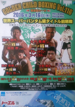 1月2日に亡くなった元東洋フェザー級王者、金子繁治名誉会長追悼記念興行として行われる今回のゴールデンチャイルドボクシング。メインを張るのは金子ジムのジム頭、元日本S・バンタム級王者の大竹秀典です。2014年に世界挑戦に失敗した大竹は、復帰してこれが3戦目。タイのサターントゥン・ソーバンカルを」相手に迎え、世界再挑戦をアピールする舞台となります。