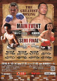セミでは熱いファイトでホールを沸せるガンバレ将太(戸髙秀樹)がコーヤ佐藤(伴流)と51.5キロ契約8回戦。将太(11勝2KO6敗1分)は昨年12月、長井一(ワタナベ)と対戦して初回にダウンを奪いながら、直後に倒されて初回逆転KO負け。悪夢を振り払う再起戦となります。プロ初黒星から3連敗中の佐藤(7勝1KO3敗1分)は再浮上を狙います。