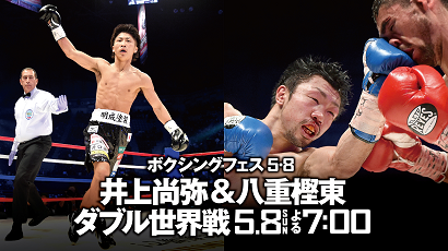 ■その井上と八重樫東(大橋)とのダブル世界戦の放送時間が5月8日19時00分~20時54分に決定。番組はフジテレビ系列で全国放送される。また、4月14日開催の「ダイヤモンドグローブ」はフジテレビで4月16日27時40分~28時40分に放送。14日はIBF世界S・ライト級指名挑戦者の小原佳太(三迫)が世界前哨戦に臨むほか、OPBFフェザー級王者の竹中良(三迫)、日本L・フライ級王者の拳四朗(BMB)がそれぞれ防衛戦を行う。