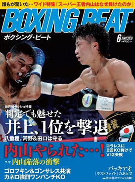 今月のボクシング・ビートは通常よりも1日早い14日に全国の書店で発売となりました。最新6月号は井上尚弥-ダビ・カルモナのWBO世界S・フライ級戦が表紙。モンスター井上が拳を負傷しつつも最終回にダウンを奪うなど大いに魅せてくれた試合のリポートも迫力のカラーページで展開。
