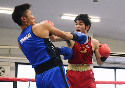 この日の注目は7年ぶり1部リーグ復帰の近大と前年2位の大商大との対戦。近大が軽量級のL・フライの芝、フライの峯が連勝して好スタートを切ったが、大商大も意地をみせる。バンタムの桑畑、池側、ライトの片山が接戦を制して逆にリードを奪った。続くライトは近大・本庄が興国高1年先輩の樋口に競り勝って3-3のタイに。