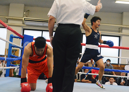 L・ウェルターは大商大・中谷、ウェルターは近大・細野がTKO勝ちして4-4で並び、最後のミドル級で勝敗が決することに。開始ゴングから近大・岩崎が攻め込んで、福森を後退させた。青コーナーに追い詰められた福森が左を出したところに踏み込んだ岩崎の右ショートストレートがカウンターでアゴに決まり、福森が前のめりにダウン。立ち上がったところに、岩崎の右が福森の顔面をとらえて、主審が試合を止めた。TKOタイムは1回1分26秒。