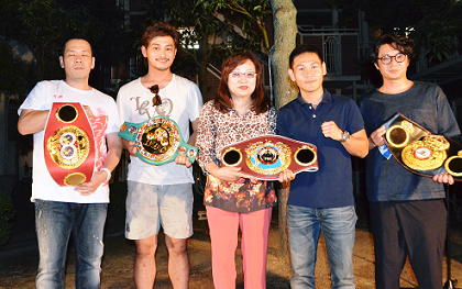 この日は米田氏主催のバーベキュー大会が大阪・堺市の自宅の庭で開かれ、高山をはじめ近畿大学ボクシング部員、ロータリークラブ会員ら180人が招待された。その席で高山が支援グループのチーム・ライトニングKのメンバーと4本のベルトを掲げてあいさつに立ち、「8月20日は5回目の王座返り咲きを必ず果たします」と決意表明した。