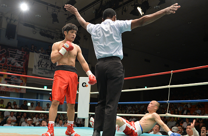 2015年全日本ミドル級新人王で現日本6位の長濱はクラスを下げて締まった体つき。右クロスで川端からダウンを奪うと、最後も右で豪快に倒して試合を終わらせた。長濱は5勝1KO1分。川端は4勝1KO10敗1分。