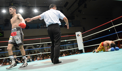 元日本ランカーのサウスポー玉川は相手の右リードを不用意に食らう、ピリッとしない立ち上がり。それでも3回から強引に出て、4回は右フックを引っかけて軽いダウンを奪う。その後またも手数が減ったが、8回に開始早々ラッシュをしかけ、オリオンをストップした。玉川は9勝3KO7敗1分、オリオンは9勝4KO12敗3分。
