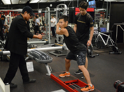 高山(33歳)は近年、試合前にトータルワークアウトのケビン山崎氏に師事して、器具を用いた様々なトレーニングにチャレンジしてきた。今回は3度にわたって東京合宿を敢行。最終日のこの日も「パンチの威力と体の切れを向上させる」ことを目的に、約1時間にわたり、山崎氏の指示する練習メニューをこなした。