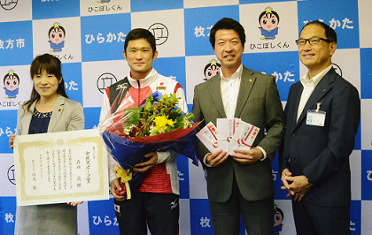 この日は五輪出場と昨年の全日本優勝をたたえるダブルのお祝いとなった。伏見市長は「枚方市民が五輪にチャレンジされるのは本当にうれしい。五輪でいい経験を積んでください」と激励。市長や議会から賞状や花束などを受けた森坂は「リオではリラックスして試合に臨み、自分のボクシングを貫いて金メダルを獲ります」と固い決意を述べた。