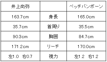 リーチは井上がわずか1.2センチ上回っただけだが、ペッチバンボーンは「井上はリーチが長いと思った」と率直な感想。胸囲でも5.6センチ下回り、井上とのパンチ力の差があるのではないかと指摘に「胸囲が大きいとかは関係ない。一緒の体重で試合をするんだ」と反論した。あすは記者会見が開かれる。