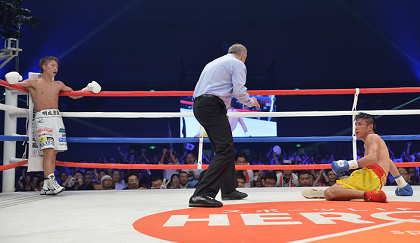 9回をジャブとフットワークでやりすごした井上は10回、ペッチバンボーンに攻め込まれると、ここから力強く反撃。打ち合いの中で右を再三決めて挑戦者がついにダウン。何とか立ち上がったものの10カウントとなった。