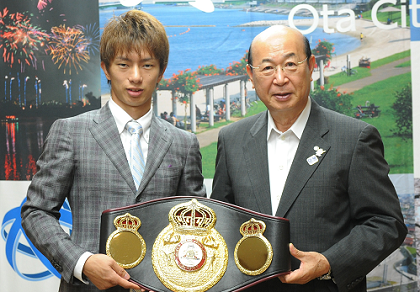 ■8月31日に4度目の防衛に成功したWBA世界L・フライ級チャンピオンの田口良一(ワタナベ)が5日、大田区の松原忠義区長を表敬訪問し、4度目の防衛を報告した。松原区長から「ぜひ、具志堅選手の記録(13度防衛)を抜いてください」と激励された田口は「できる限り数多く防衛を重ねていきます」と回答。田口は大田区出身で、今回も“ホームグラウンド”の大田区総合体育館で挑戦者の宮崎亮(井岡)に判定勝ちした。=写真提供:ワタナベジム=