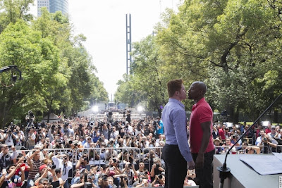 6月30日メキシコシティをサーキットしたメガファイト、“ジ・ワン”、フロイド・メイウェザー×サウル“カネロ”アルバレスのプレゼンテーション・ツアー。中心部に近いロス・ニーニョス・エロエス(子供のヒーローたち)記念塔で開催されたイベントに何と3万2000人ものファンが集まったという。この数字はおそらく周辺にいた通行人や住人もカウントしたものと推測されるが、それにしてもすごい数だ。