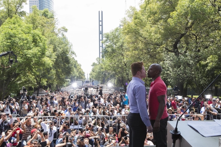 6月30日メキシコシティをサーキットしたメガファイト、“ジ・ワン”、フロイド・メイウェザー×サウル“カネロ”アルバレスのプレゼンテーション・ツアー。中心部に近いロス・ニーニョス・エロエス(子供のヒーローたち)記念塔で開催されたイベントに何と3万2000人ものファンが集まったという。この数字はおそらく周辺にいた通行人や住人もカウントしたものと推測されるが、それにしてもすごい数だ。