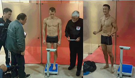 ■IBF世界S・ライト級タイトルマッチの当日計量が9日午前8時から試合地のモスクワで行われた。S・ライト級はリミットが140ポンド(63.50キロ)で、当日計量では10ポンド(約4.5キロ)以上の増量が許されず、当日のリミットは150ポンド(68.03キロ)。挑戦者の小原佳太(三迫)は67.55キロで一発クリアしたが、王者エドゥアルド・トロヤノフスキー(ロシア)は68.20キロ。超過により2時間の猶予が与えられた。チャンピオンは1時間半後の再計量で67.60キロをマークし、立会人が試合成立を宣言した。試合は日本時間の10日午前5時ごろにゴングの予定。 =写真提供:三迫ジム=