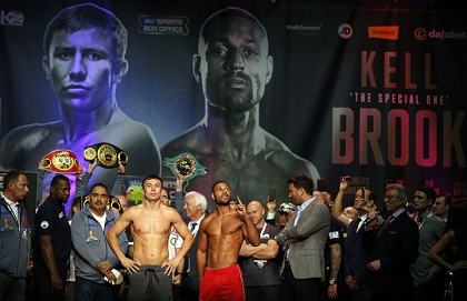 ザ・フォーラムより先に行われるWBC&IBF世界ミドル級タイトルマッチは、英国ロンドンのO2アリーナで決戦のゴングを聞く。前日計量で王者ゲンナジー・ゴロフキン(カザフスタン)が158.8ポンド(72.03キロ)、挑戦者のIBF世界ウェルター級王者ケル・ブルック(英)が159.4ポンド(72.30キロ)でリミットの160ポンドをクリアした。