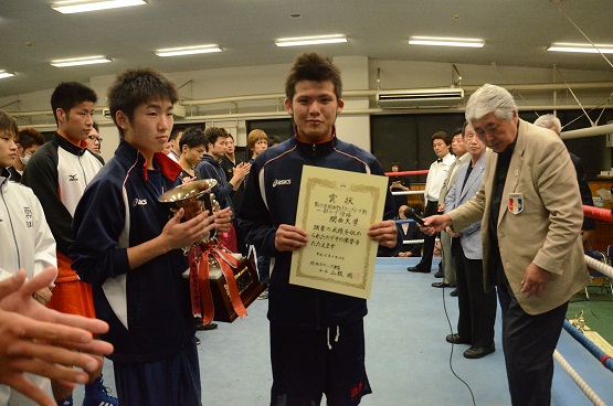 圧倒的な強さをみせつけてきた関大も、なぜか同大には相性が悪く、この日も苦しい展開。初戦L・フライ級で寺地主将が小原を3回RSCで破り好スタートを切ったものの、バンタムで平尾が鼻血が止まらずRSC負け。ウェルターも大口が入江にポイント負けし、この時点で4-4のタイ。勝負は最終試合のミドル級に持ち越された。ここで関大金、同大宮崎ともなかなか手が出ず、再三主審の勧告を受ける試合展開となったが、わずかに優勢に試合を進めた宮崎が勝ち、関大に一矢報いた。