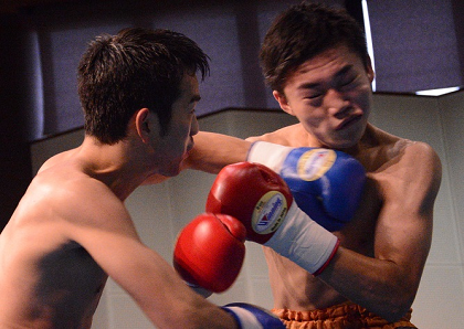 左を叩き込むフェザー級で勝利の今田(左)