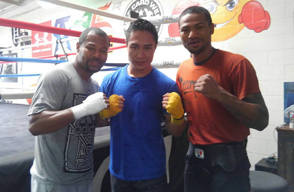 ■日本S・ウェルター級9位のコブラ諏訪(ピューマ渡久地)が29日、18日から米ロサンゼルスで行っていたキャンプを打ち上げた。滞在中は元3階級制覇王者のビッグネーム、シェーン・モズリーからクリンチワークのアドバイスを受け、モズリーの息子、S・ミドル級のモズリーJrとスパーリングをして腕を磨いた。諏訪は12月にバンコクに飛び、4月に同地で獲得したWBCアジア王座の防衛戦を行う予定。=写真提供:ピューマ渡久地ジム=