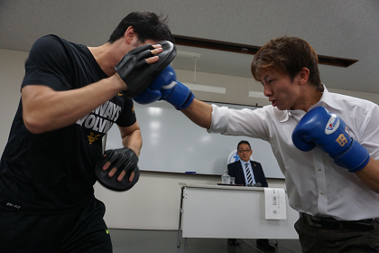 田口は渡辺会長、石原雄太トレーナー、同門の福原力也とともに講演会に出席。先週風邪を引いて「練習を3日休んだ」という田口だが、集まった参加者の前で元気にミット打ちを披露したほか、体験ミット打ちのミット持ちも務めてファンを喜ばせた。