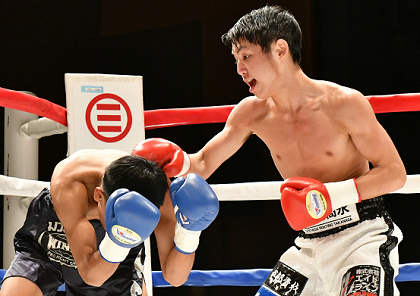 セミの56キロ8回戦はノーランカーの芹沢天明(姫路木下)の強打がさく裂、OPBFフェザー級8位の松岡輝(ひかる=大成)を4回TKOで下した。芹沢は9勝5KO3敗。
