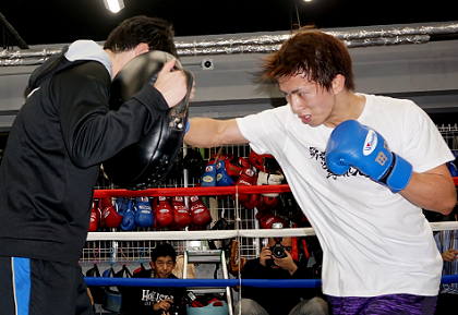 この日のミット打ちではコンビネーションバッグを体に巻いた石原トレーナーが田口を押し込み、田口がそれを相撲のように押し返し、あるいはポジションをずらしてまわりこんで連打を見舞うという動きを繰り返した。