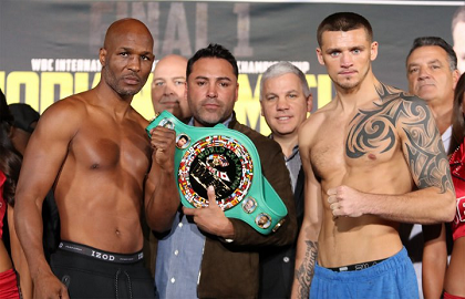 米カリフォルニア州イングルウッドのザ・フォーラムで17日(日本時間18日)ゴングとなるイベントの前日計量が行われ、この試合をラストファイトと宣言しているバーナード・ホプキンス(米)が174ポンド(78.92キロ)、対戦相手のWBC・L・ヘビー級3位ジョー・スミスJr(米)がともに175ポンド(79.37キロ)でリミットをクリアした。試合はスミスが保持するWBCインターナショナルL・ヘビー級王座がかけられる。