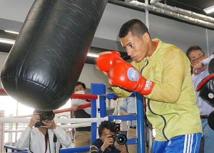 大みそかの大田区総合体育館でWBA世界L・フライ級王者の田口良一(ワタナベ)に挑戦する同級3位カルロス・カニサレス(ベネズエラ)が25日、ワタナベジムで練習を公開、メディアのインタビューに答えた。