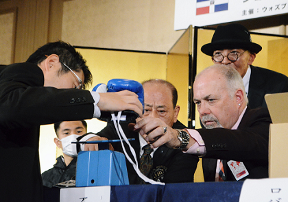 WBA世界フライ級、IBF世界S・バンタム級ダブルタイトルマッチ(31日・島津アリーナ京都=京都府立体育館)の調印式、前日計量が30日、京都市のANAクラウンプラザホテル京都で行われた。
