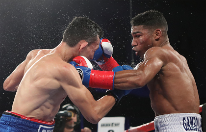 ブランク明けの感触を確かめるようにスピードとスキル主体のボクシングに徹する。9回、連打でアルバラード(井岡一翔に挑戦したフェリックス・アルバラードの双生児の弟)を倒すが主審はスリップと判断。逆に10回、スリップ気味ながらガンボアが倒れるとカウントが入った。しかしスコアは97-92×2、97-93の3-0でガンボアの手が上がった。Photos:Tom Hogan Photos/Golden Boy Promotions