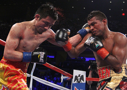 4階級制覇王者、WBC世界S・フライ級チャンピオンのローマン・ゴンサレス(ニカラグア=写真右)が18日、ニューヨークMSGで初防衛戦を行い、挑戦者の元王者シーサケット・ソールンビサイ(タイ=写真左)に0-2判定負け。プロ47戦目で初黒星となった。スコアは114-112×2でシーサケット、残りが113-113だった。