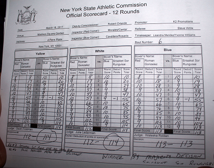 CompuBoxが出したスタッツ(ヒット数/パンチ数)は、ゴンサレスがトータルで441/1013(的中率43.5%)、シーサケットが284/940(同30.2%)。ジャブはゴンサレス69/354(19.5%)、シーサケット7/176(4%)、パワーパンチがゴンサレス372/659(56.4%)、シーサケット277/764(36.3%)。数字上ではゴンサレスが上回った。