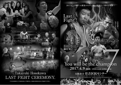 ■9日住吉区民センターで開催の「You will be the champion7」で元日本、OPBF・S・ウェルター級王者の細川貴之(六島)が引退試合。ティーラサック・ケーマックスジム(タイ)に3-0判定勝ち(80-72、79-73、79-75)。32歳の細川は29勝9KO11敗5分でボクシング人生にピリオドを打った。そのほかの主な結果は以下の通り。