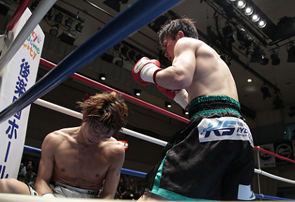 長身サウスポーの日野が初回、右フックで坂本からダウンを奪った。その後も日野がジャブ、右フックでリードを広げる。坂本は距離を詰められず、コンスタントに被弾してダメージを蓄積。6回に日野が左を決めたところでストップ。4連続KO勝ちの日野は10勝6KO1敗1分。弁護士ボクサーの坂本は7勝2KO8敗。