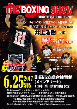 東京都町田市で初のボクシング興行となる「THE BOXING SHOW」が6月25日、町田市立総合体育館で開催される。メインイベントでは、日本S・ライト級7位の井上浩樹(大橋)がタイ人選手と“日本タイトル前哨戦”を行う。昨年1月、町田市近隣の横浜市緑区に誕生したK&Wジムと大橋ジムの主催。