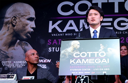 米カリフォルニア州カーソンのスタブハブ・センターで8月26日ゴングとなるWBO世界S・ウェルター級王座決定戦の記者会見が31日、ロサンゼルスで開かれ、同級1位にランクされるプエルトリコのスター、ミゲール・コットと5位の亀海喜寛(帝拳)が出席した。